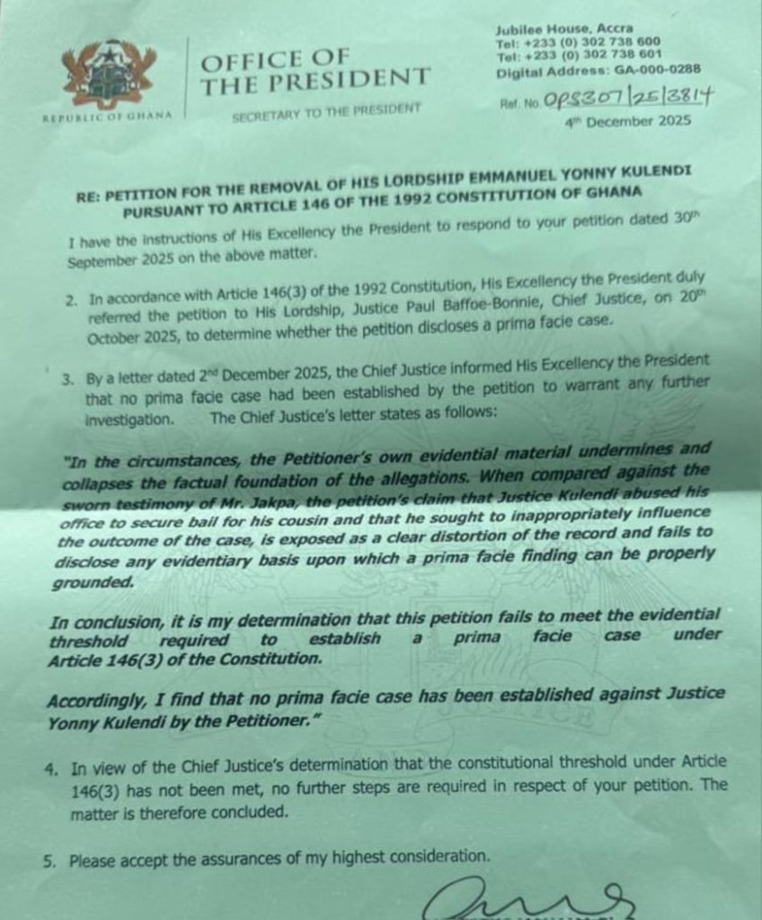“In view of the Chief Justice’s determination that the constitutional threshold under Article 146(3) has not been met, no further steps are required in respect of your petition. The matter is therefore concluded,” President Mahama’s letter to Daniel Marfo Ofori-Atta concluded.