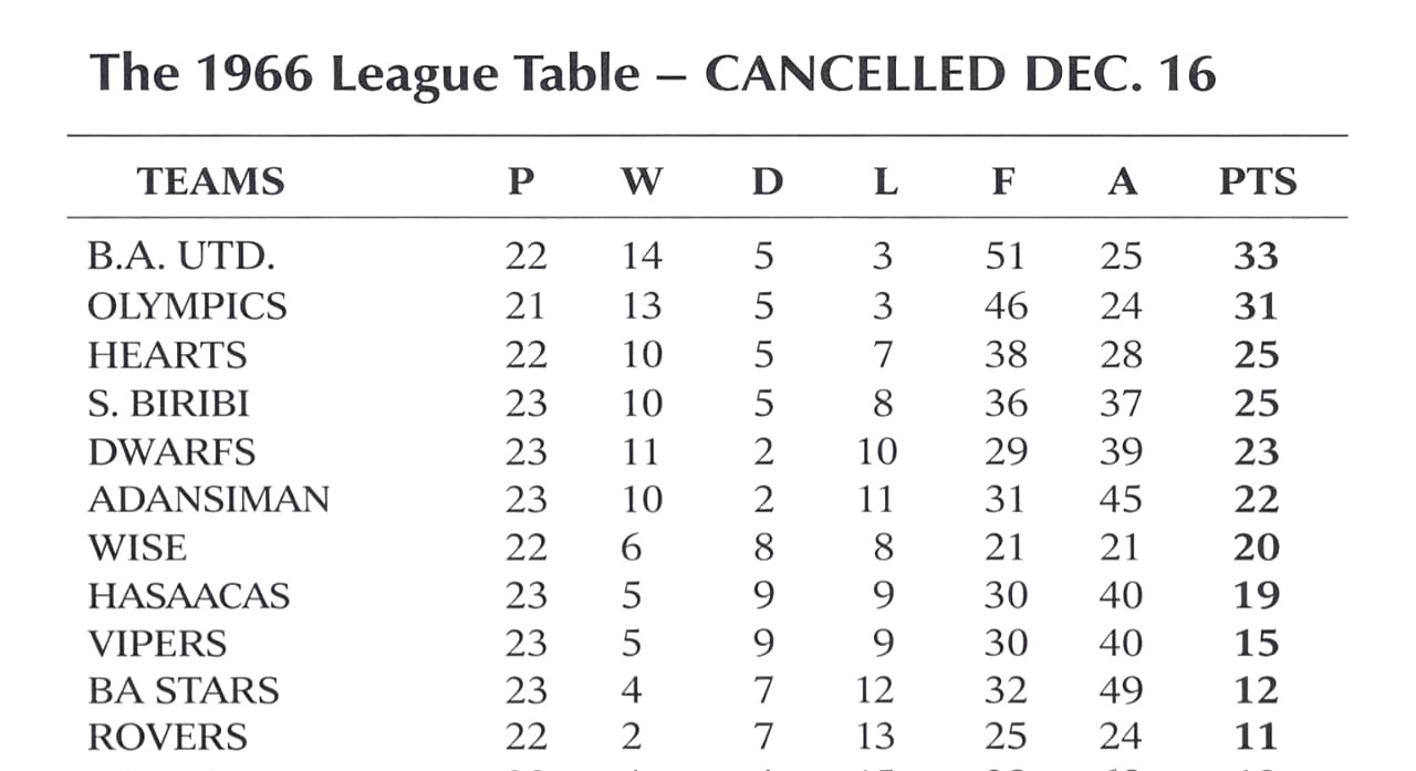 On Dec 15 The Commissioner for Education and Sports, A. K. Deku called a meeting of the clubs, COS and GAFA and it was decided to cancel the league. The GAFA was tasked to arrange special friendly matches for the clubs until a programme for the next season was drawn.