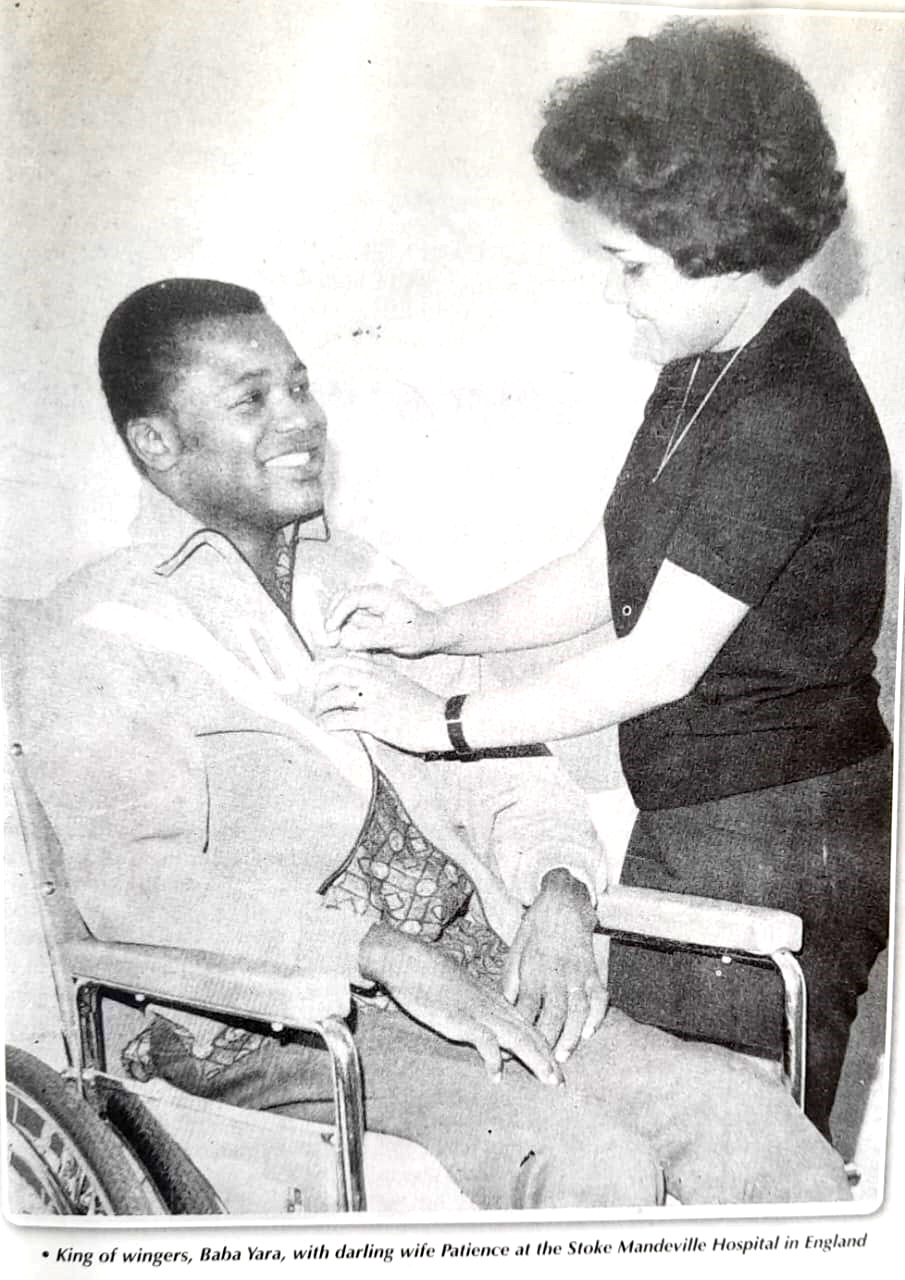 Yara, accompanied by Dr R. O. Addae, surgical specialist from the 37 Military Hospital was flown to England where he was treated at the famous Stoke Mandeville Hospital for spinal injuries.